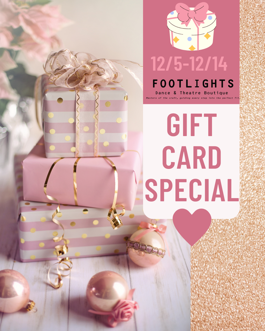You receive the gift card automatically after purchase. Please allow up to an hour to receive the automated email with the gift card details. Check your junk mail folders as well. If you do not receive your card, please email us at info@dancefootlights.com with your order number and we will assist you.
