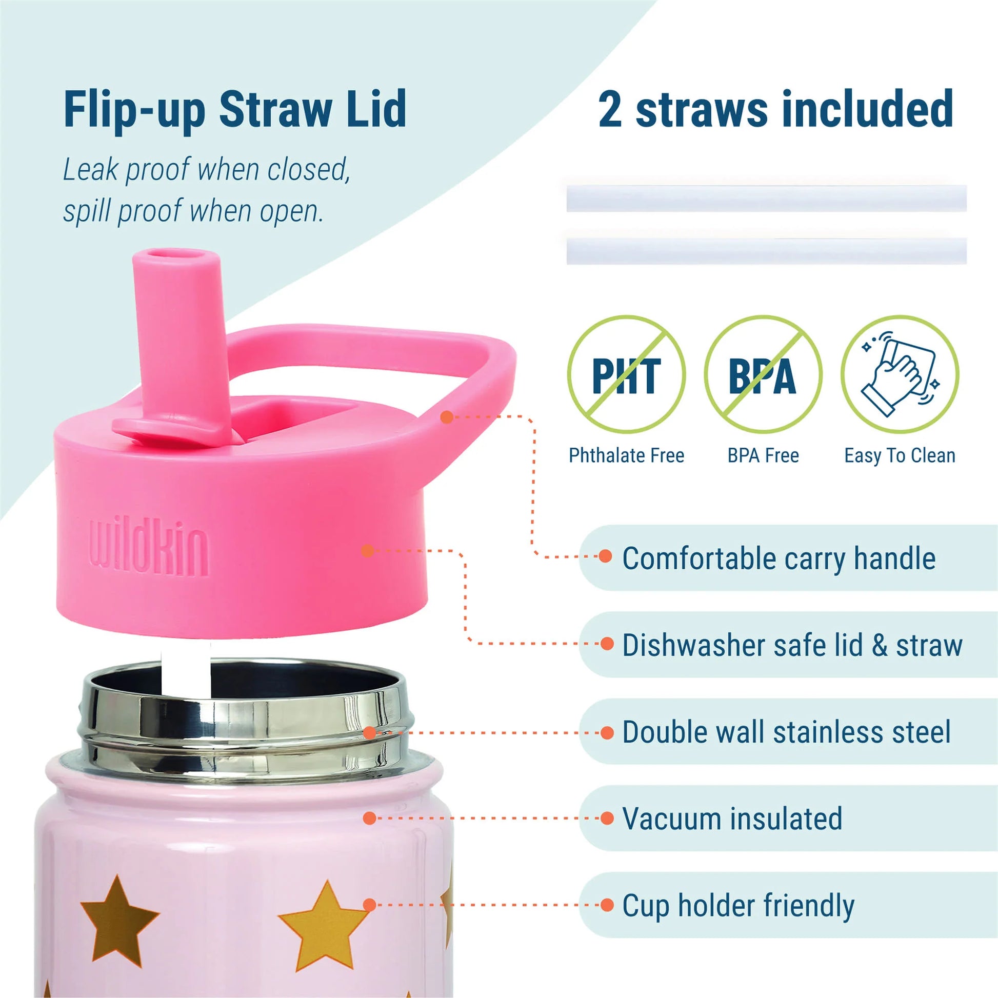 Wildkin's stainless steel water bottle combines an eye-catching design that kids will love and parent-approved features.